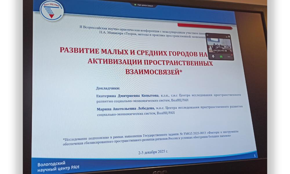 2–3 декабря 2025 г. в Институте экономических исследований ДВО РАН (г. Хабаровск) состоялась II Всероссийская научно-практическая конференция с международным участием памяти академика П.А. Минакира «Теория, методы и практика пространственной экономики». Результаты исследований Вологодского научного центра РАН в рамках выполнения Государственного задания № FMGZ-2025-0013 «Факторы и инструменты обеспечения сбалансированного пространственного развития регионов России в условиях обострения больших вызовов» были представлены в докладе «Развитие малых и средних городов на основе активизации пространственных взаимосвязей» с.н.с. к.э.н. Е.Д. Копытовой и м.н.с. М.А. Лебедевой.