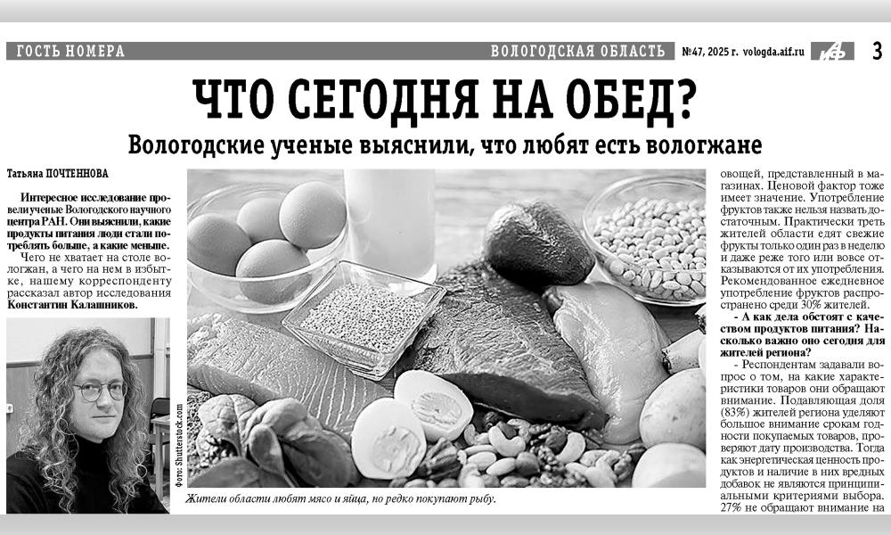 Издание «Аргументы и факты» (№47, 2025) опубликовало статью корреспондента Татьяны Почтенновой «Что сегодня на обед? Вологодские ученые выяснили, что любят есть вологжане». Старший научный сотрудник Центра социокультурных и политических исследований Вологодского научного центра РАН Константин Николаевич Калашников рассказал о том, какие продукты питания жители региона включают в свой повседневный рацион, достаточно ли полноценно и сбалансированно их питание.