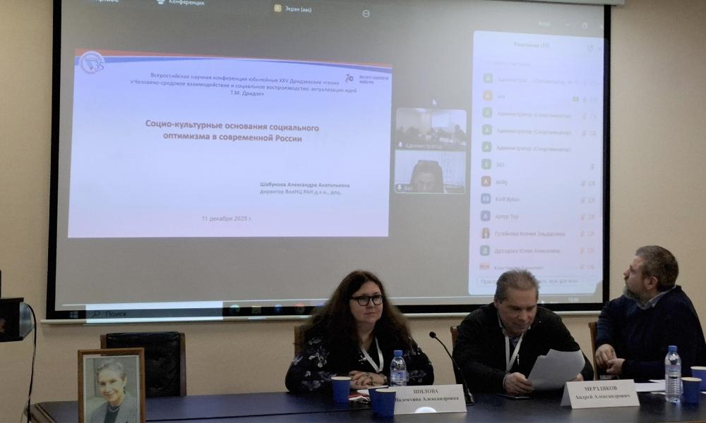 11 декабря 2025 года на базе Института социологии ФНИСЦ РАН состоялись юбилейные ХХV Дридзевские чтения «Человеко-средовое взаимодействие и социальное воспроизводство: актуализация идей Т.М. Дридзе». Организаторами конференции выступили Институт социологии ФНИСЦ РАН, Российское общество социологов, а также Социологический факультет ГАУГН. Результаты исследований ВолНЦ РАН были представлены в докладах директора ВолНЦ РАН д.э.н. А.А. Шабуновой, заведующего Центром социокультурных и политических исследований в.н.с. к.э.н. К.Е. Косыгиной, младшего научного сотрудника Центра социокультурных и политических исследований А.Э. Ждановой, материалы которых открывают новые горизонты для понимания сложных процессов, влияющих на формирование современного городского пространства, обогащают научную дискуссию, предлагают конкретные решения для повышения устойчивости и конкурентоспособности российских городов.