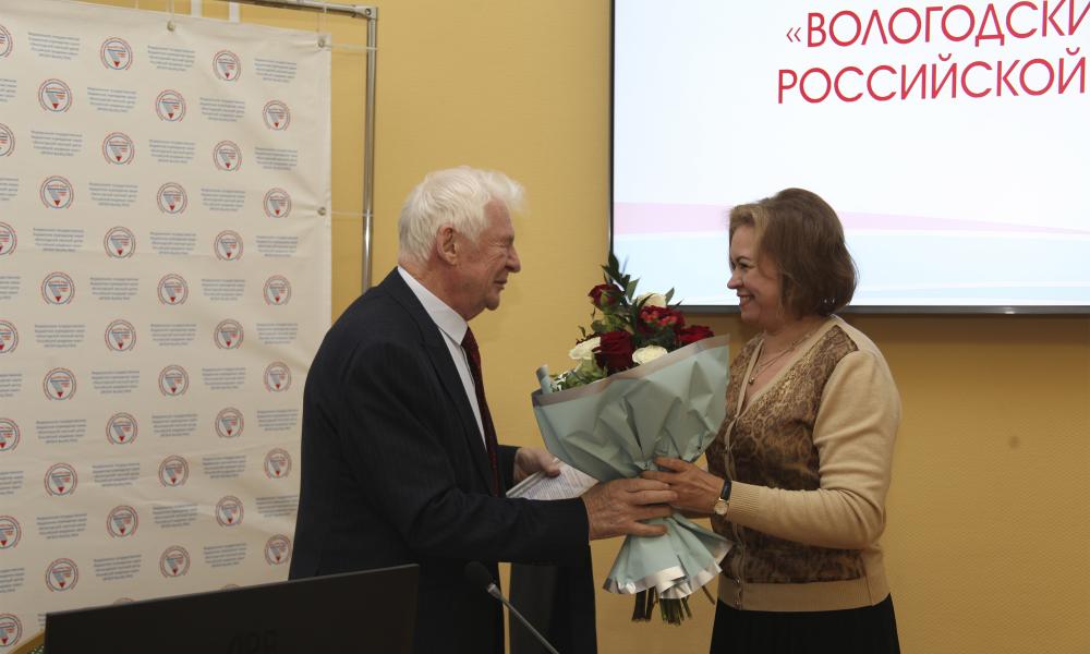 Председатель Вологодской областной организации Общероссийского Профсоюза образования, первый заместитель председателя Общественной палаты Вологодской области С.В. Павлушкова вручила поздравительный адрес от Общественной палаты Вологодской области и наградила В.А. Ильина медалью «За заслуги перед обществом».