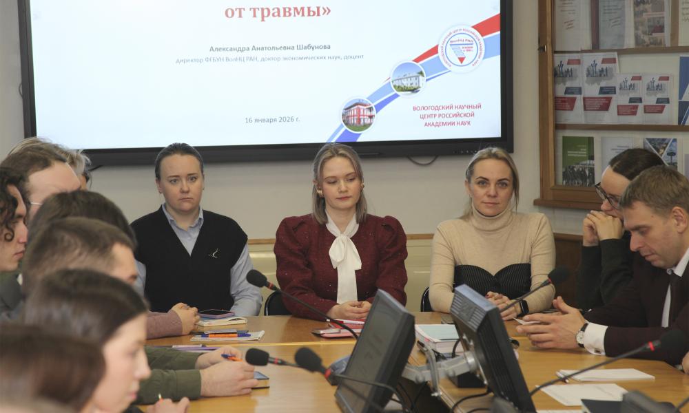 16 января 2026 года в Вологодском научном центре РАН состоялась встреча магистрантов, аспирантов и молодых ученых с научным руководителем ВолНЦ РАН, членом-корреспондентом РАН, д.э.н., профессором Владимиром Александровичем Ильиным. Мероприятие прошло в преддверии его 85-летнего юбилея и стало открытым диалогом о науке, жизни, ценностях и будущем Центра. В рамках встречи прошло обсуждение монографии «На трудном пути к исцелению от “травмы”…: о реализации В.В. Путиным курса национального развития Российской Федерации», подготовленной членом-корреспондентом РАН, д.э.н., профессором В.А. Ильиным и в.н.с. Центра социокультурных и политических исследований к.э.н. М.В. Моревым, в которой представлены некоторые результаты долгосрочного мониторинга эффективности государственного управления, проводимого ВолНЦ РАН с середины 1990-х гг.